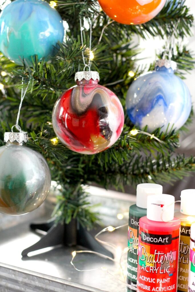 Your tree will have a lively, artistic touch. Clear ornaments should be filled with a few drops of acrylic paint, carefully swirled.