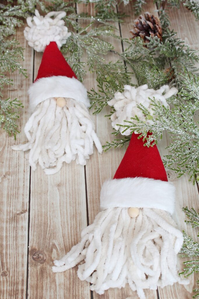Hang them close to warm fairy lights, the soothing illumination makes the red hat stand out and the yarn beard appear fluffy.
