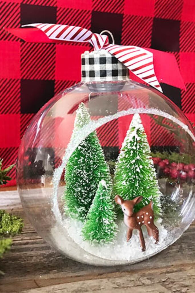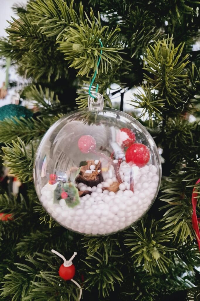 Your tree becomes a miniature winter wonderland with this clear snow globe ornament, use tweezers.