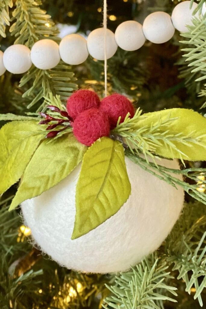 Tiny red pom-poms for berries to a white felt or foam ball. Use string or twine. Ideal for Scandinavian or country décor.