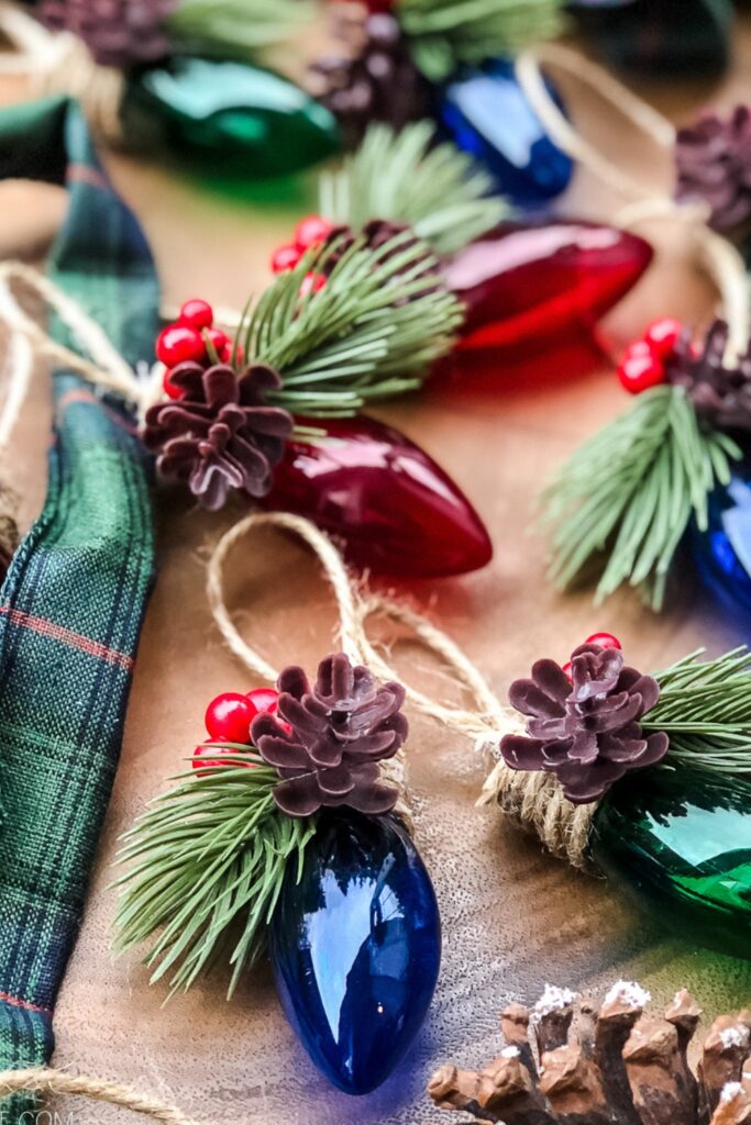 Add tiny pinecones, fake greenery, and red berries close to the top after using large plastic or glass light bulbs wrap the base in jute.