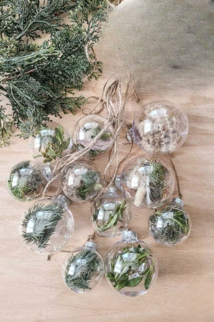 Add tiny sprigs of pine, rosemary, or dried moss to clear plastic or glass decorations, then secure them with jute rope.