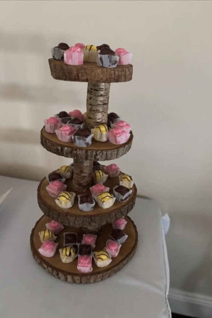 This wooden tier arrangement is ideal if you’re looking for a solid stand for formal occasions like weddings.