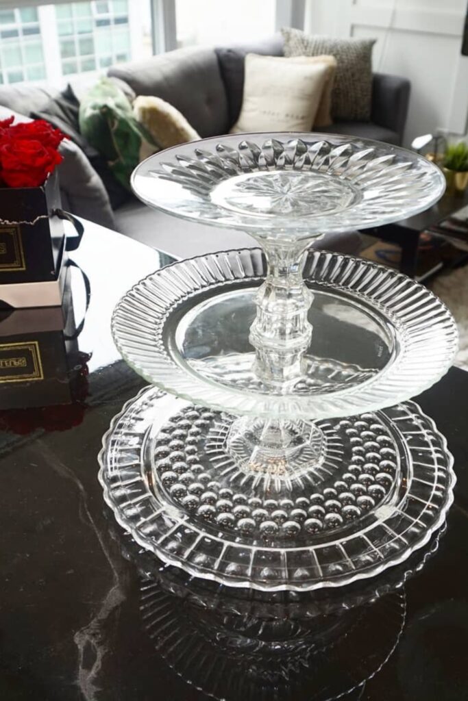 This clear-glass stand is perfect for formal occasions like weddings. Simply use strong adhesive to stack glass plates.