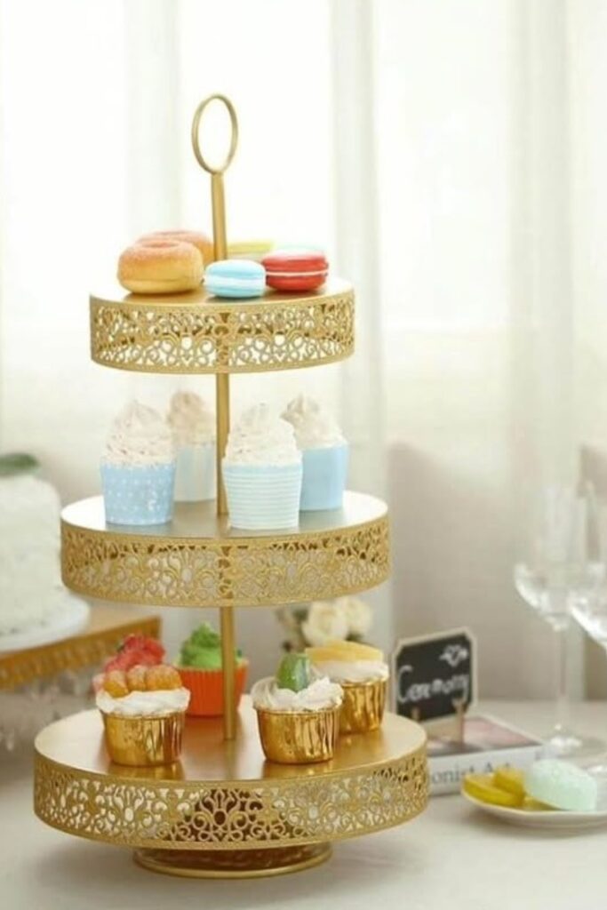 This gold tier design is ideal for tea parties, bridal showers, or small festivities if you want a stand that feels elegant right away.