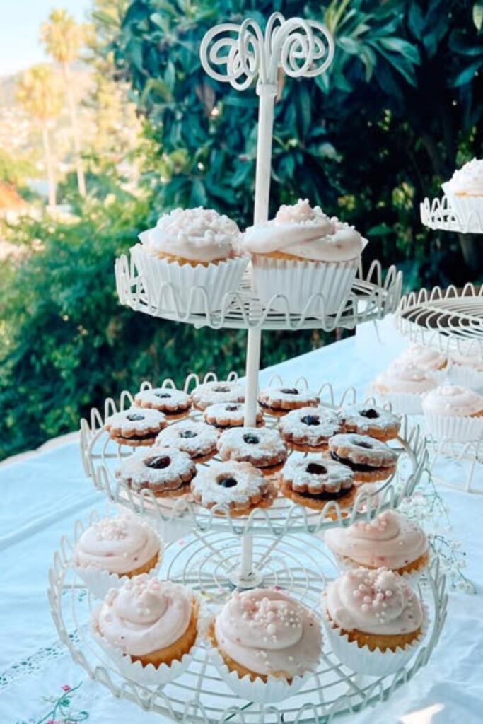 This vintage wire stand is a fantastic option for an outdoor event. You can replicate it with white-painted tiered metal racks.