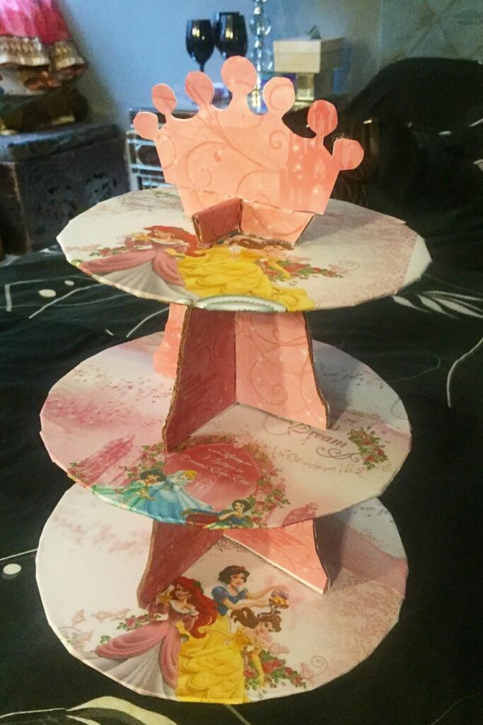 You can replicate it by printing princess designs and covering circular boards, or by using pre-cut cardstock tiers.