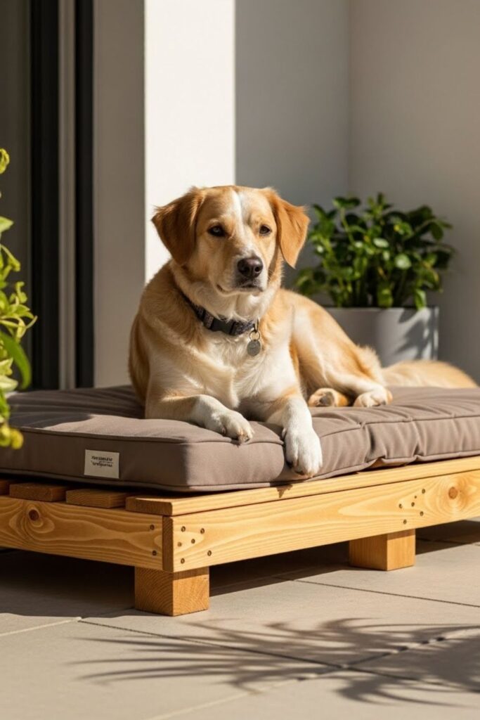 Patio and yard beds need materials that don’t soak or rot. A simple pallet base with a weather-resistant cushion works well for this.