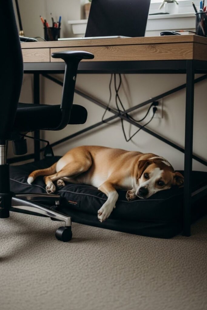 Some dogs refuse to relax unless they’re near you. A slim bed designed to slide under a desk solves that without clutter.