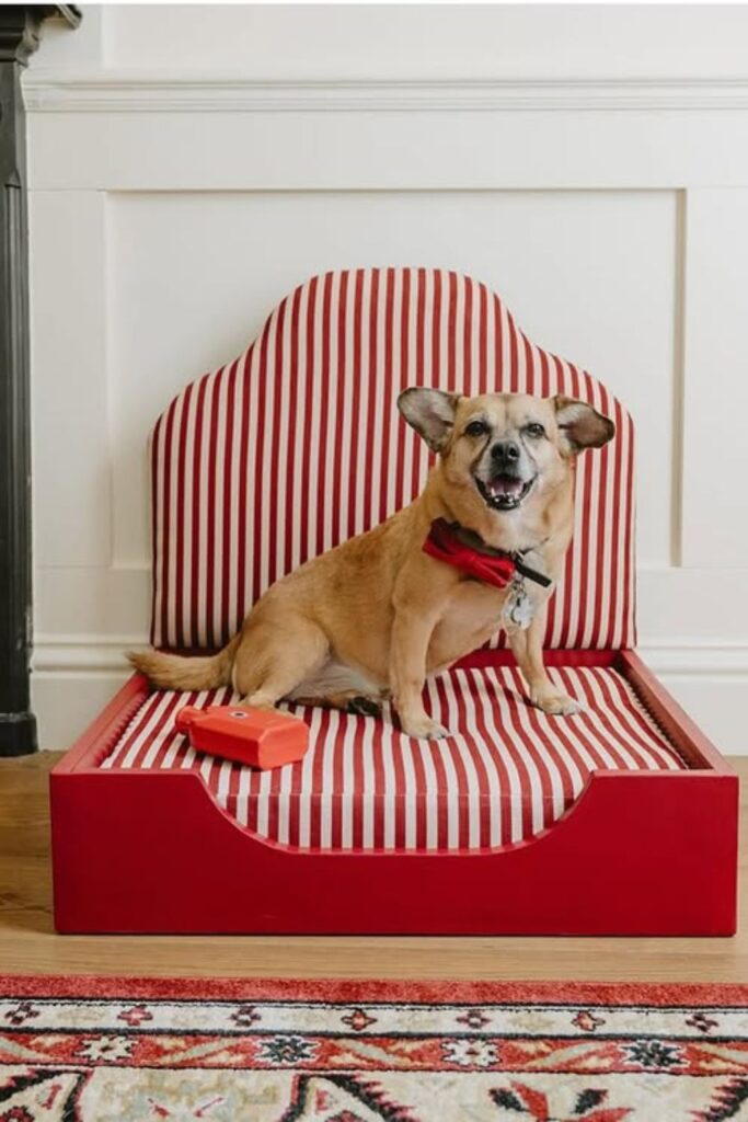 Dogs that sprawl and stretch end up loving furniture-style beds with open sides. A curved wooden base lifts the cushion slightly while keeping the entry low.