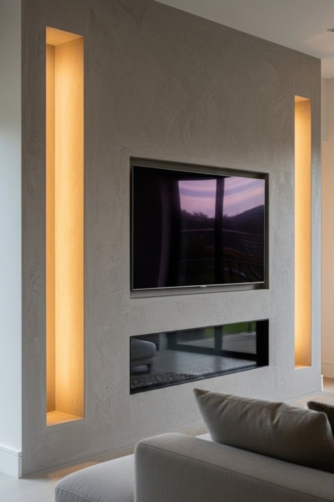 Use lighting sparingly; LED strips, shelf lights, or wall washers are enough. If the wall already has texture, skip extra décor and let the finish do the work.