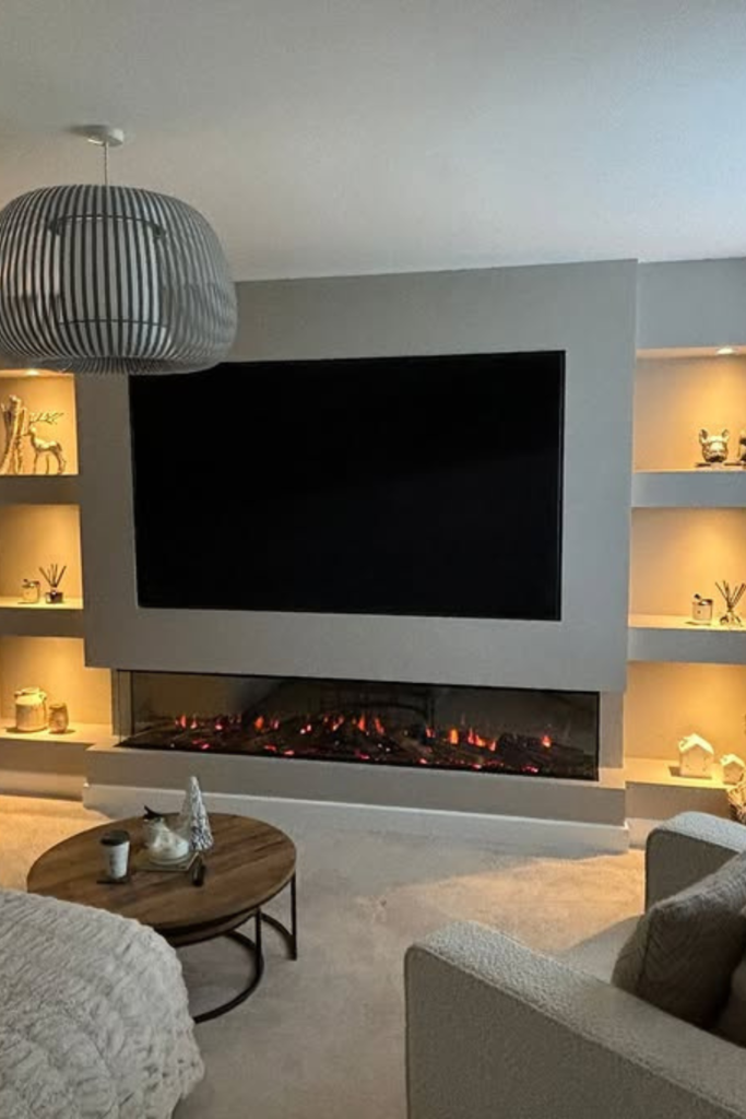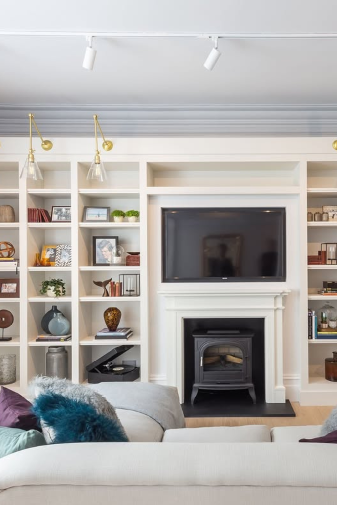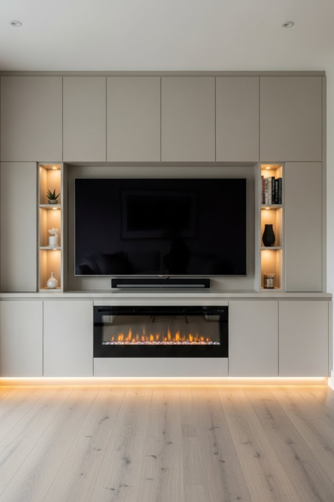 Recess the TV and fireplace into the panel, while ceiling lights are kept to a minimum, warm shelf LEDs create depth.