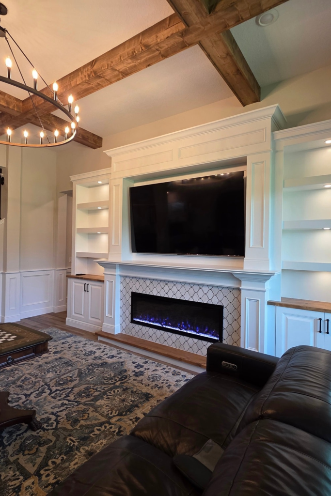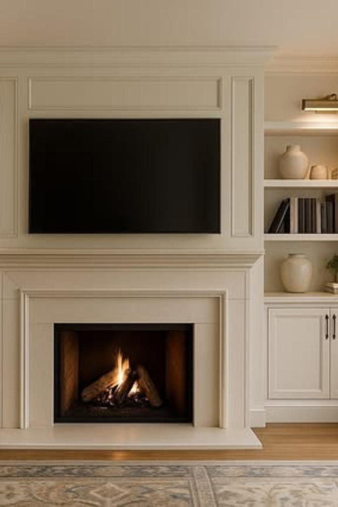 This concept is most effective in living areas, where the fireplace wall should feel like furniture rather than an added element.