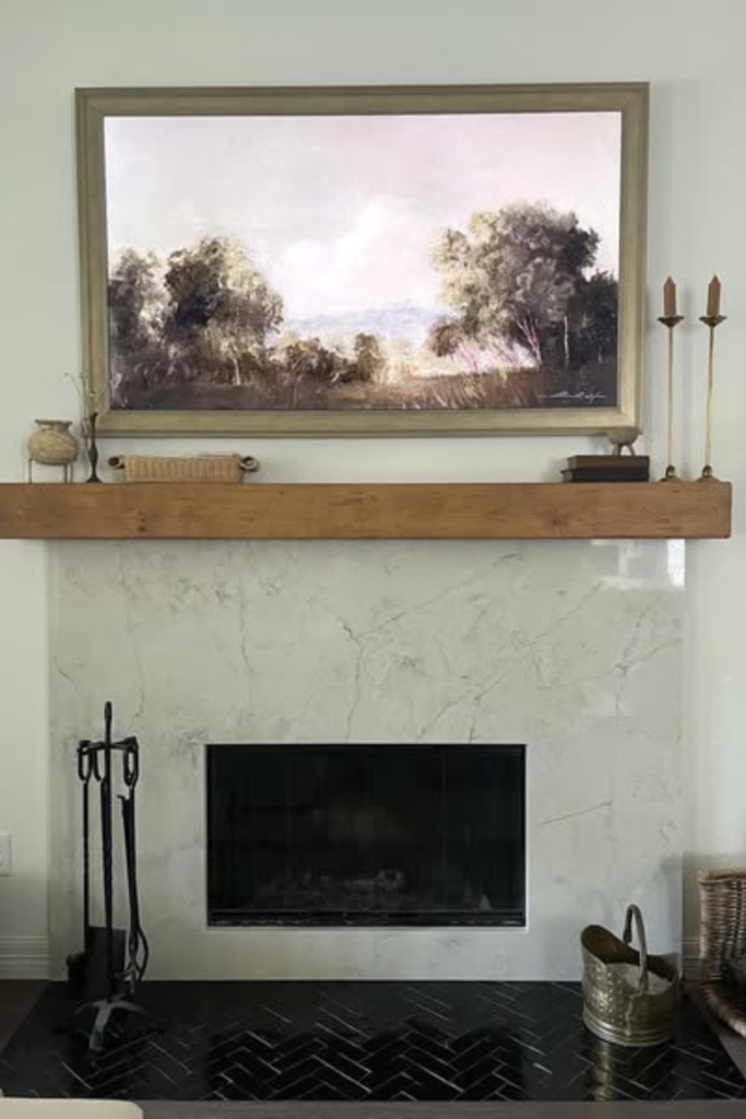 Use a solid wood mantel and stone or slab finishes to keep the surroundings simple, letting natural light shine through.