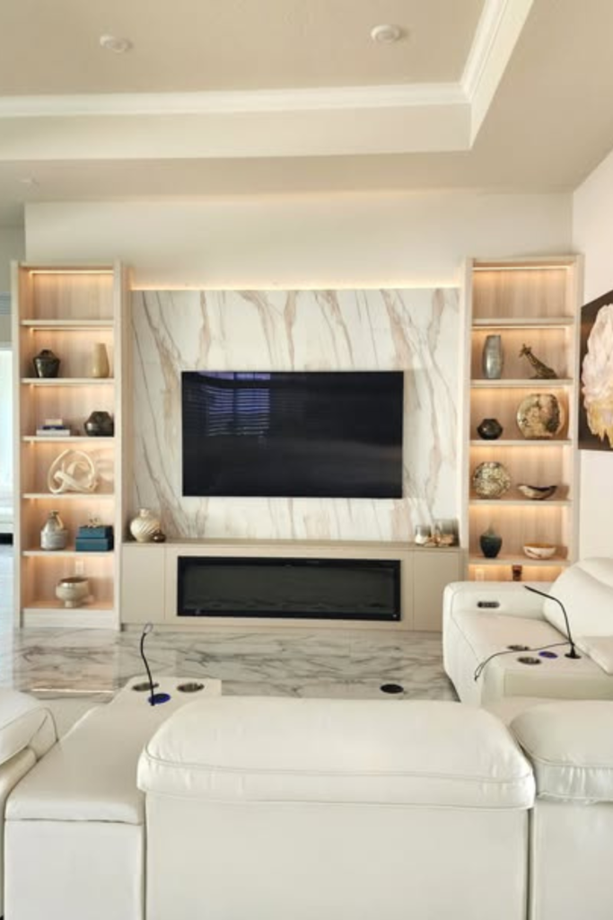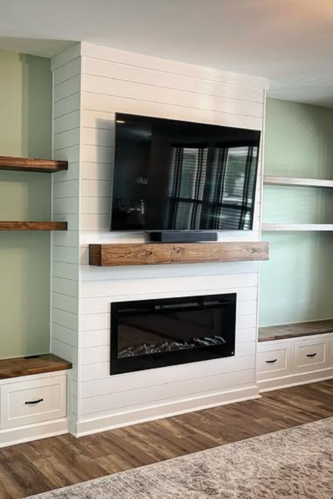 Build the TV and fireplace in the middle, add shelving and cabinets along the wall for a personalized appearance.