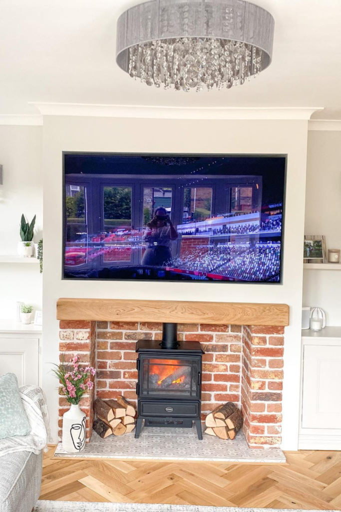 Mount the TV tightly above the fireplace so that it appears as a single vertical feature, and keep the fireplace enclosed.