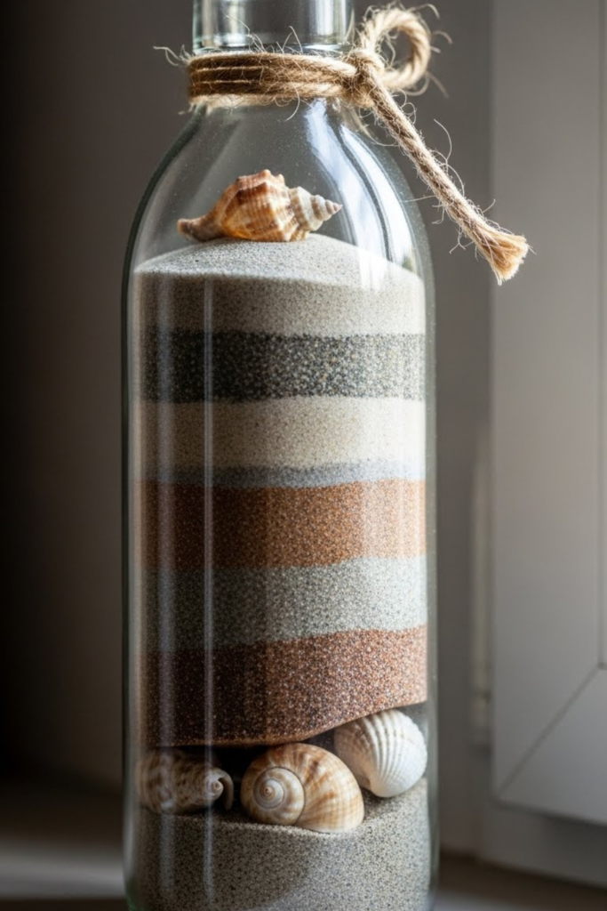 Add layers of sand, shells, or tiny pebbles to a transparent bottle. Put a small tag or thin string around the neck.