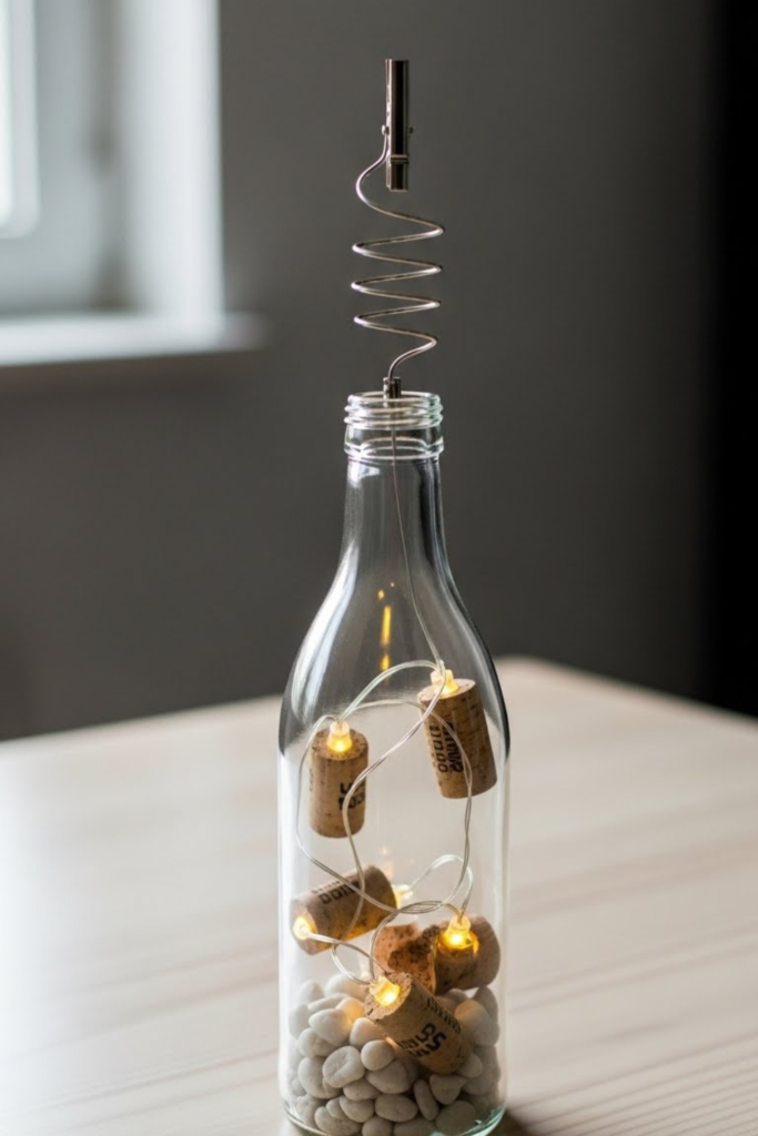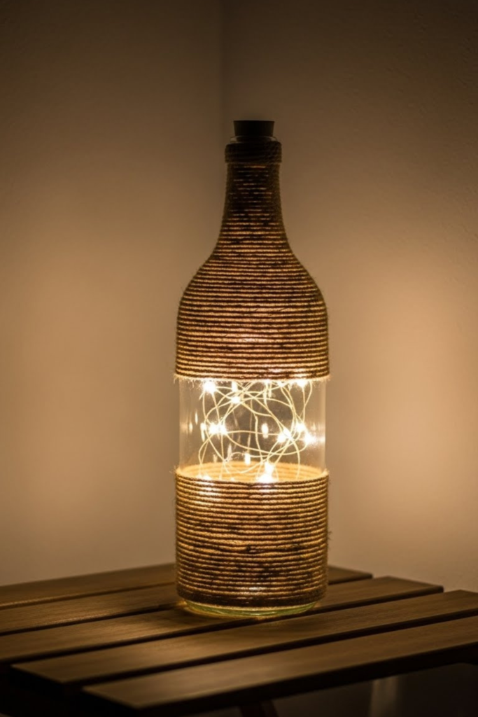 Encircle the neck with jute rope, accentuate the colors at night, place asoft, warm LED cork light inside.