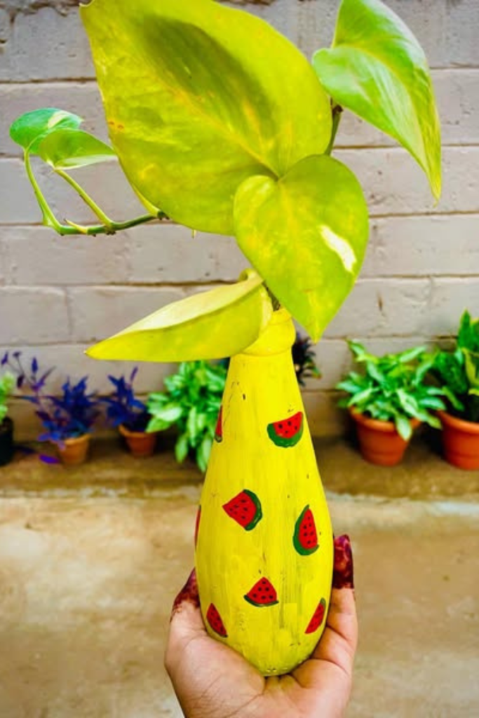 Use the bottle as a water-propagation vase or tiny planter after painting it a bright base color and adding basic fruit or pattern features.