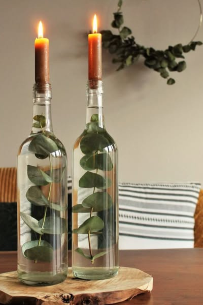 Keep things simple, fill the bottle with water, and add eucalyptus or any robust leaves to make them stand straight.