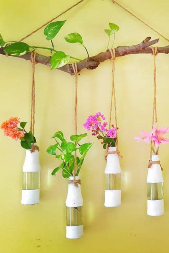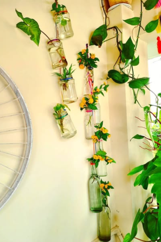 Grow money plant cuttings or tiny flowering stems after hanging bottles at various heights using sturdy rope or wire.