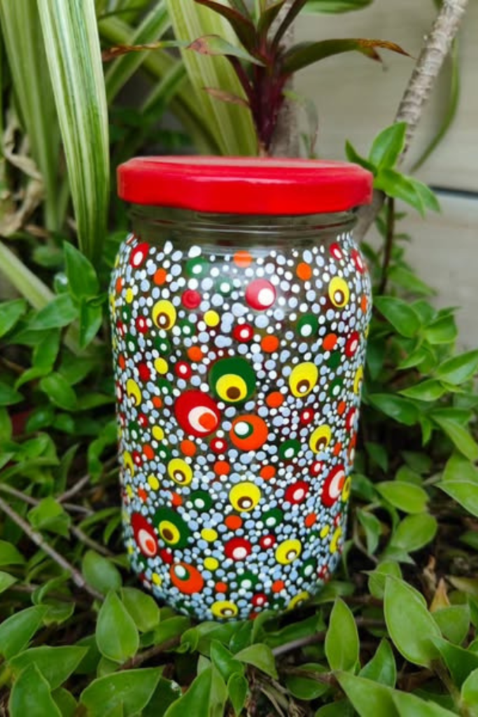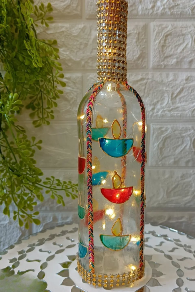 Paint basic diya shapes directly onto the glass. Use multicolored fairy lights within, use mirror trim, or lace to complete the neck.