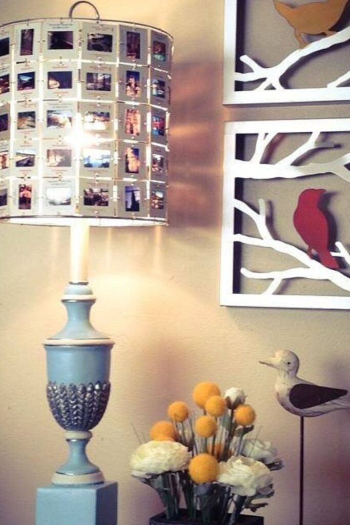 Attach old photo slides to a wire frame using small clips or jump rings, spacing them evenly so light may shine through.