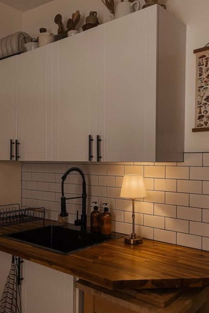Produce that soft pool of light that makes the entire kitchen feel peaceful and welcoming, install a low-watt LED lamp inside.