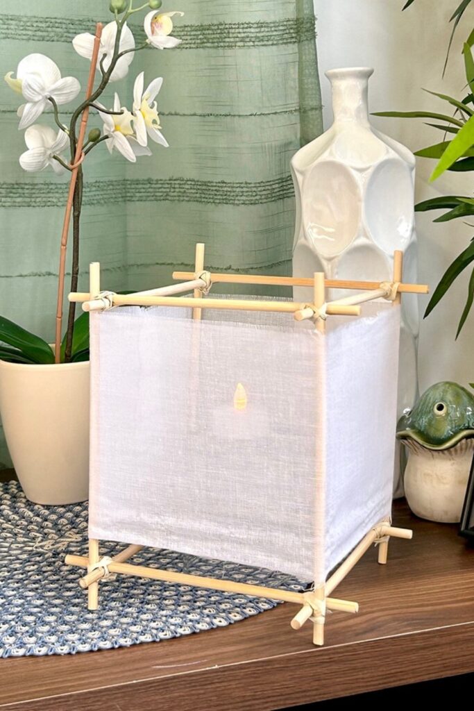 This basic bamboo lantern works great on consoles, side tables areas. Build a small cube frame using bamboo sticks.