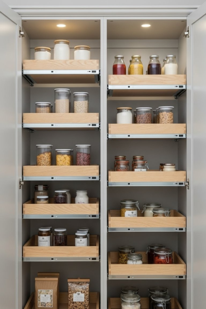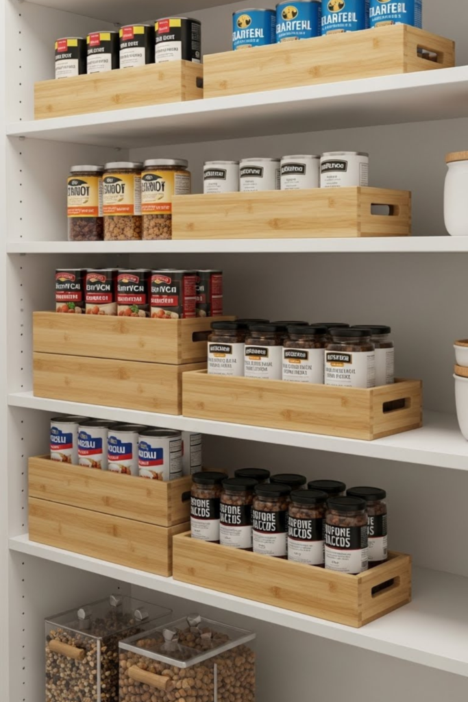 Shelf height feels squandered, tiered inserts double visibility. Standard-depth pantries with fixed shelves.