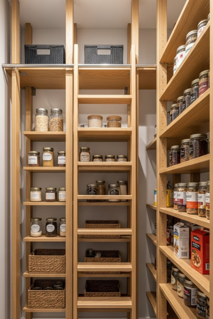 Reach-in pantries with a single open wall are ideal. Construct a ladder-like structure with vertical side rails.