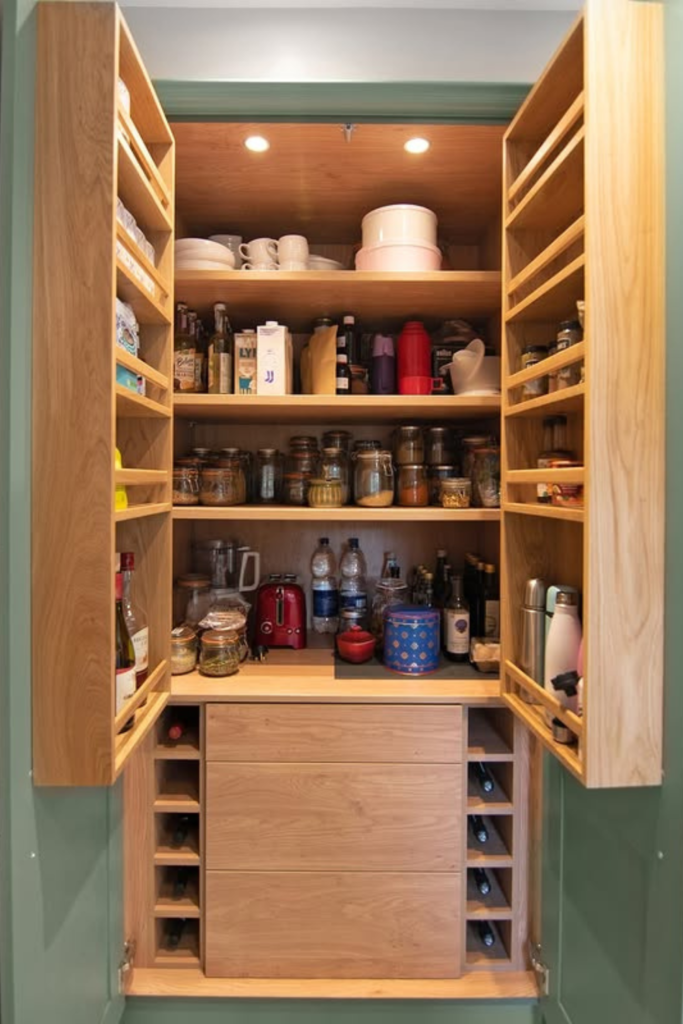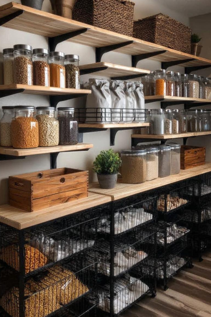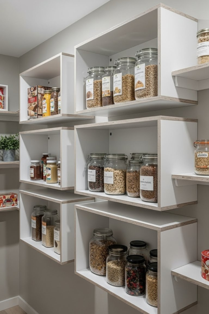 You want structure, open box shelves keep things sturdy and organized. Family pantries with diverse storage are idea. Construct plywood box units.