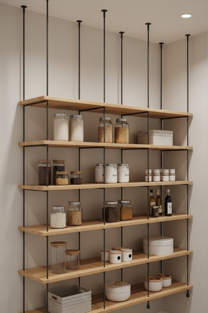 Hanging shelves frees up floor space when space is limited. Small pantries with sturdy ceiling framing.