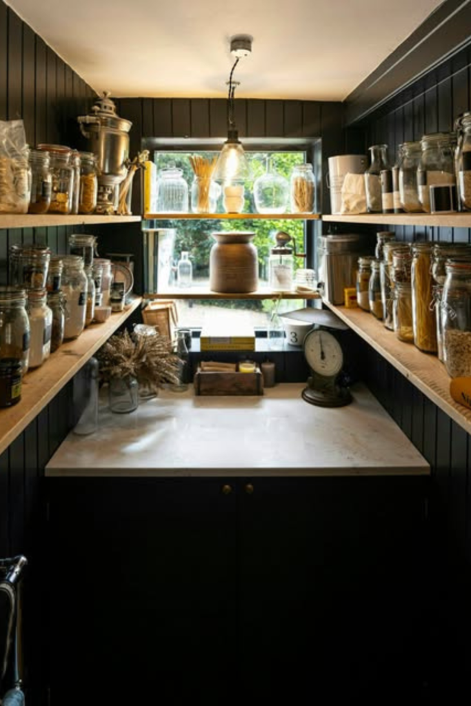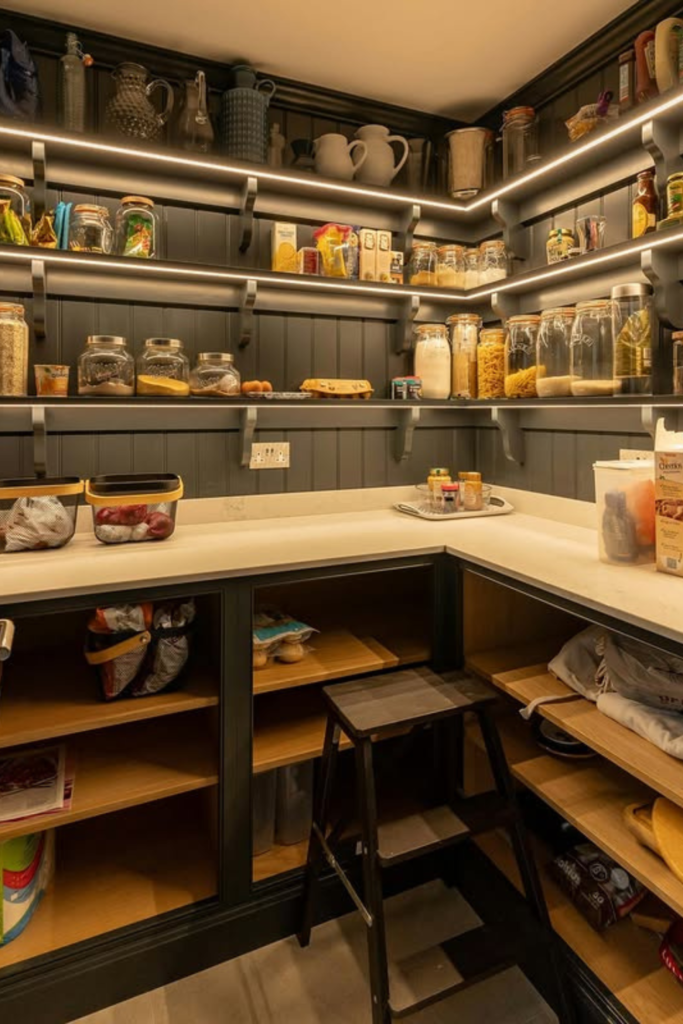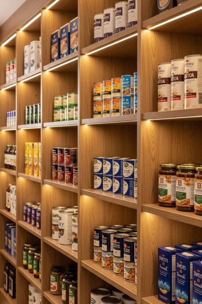 Use soft,warm overhead lighting that illuminate. Lower shelves or deep pantry cupboards are ideal for this.