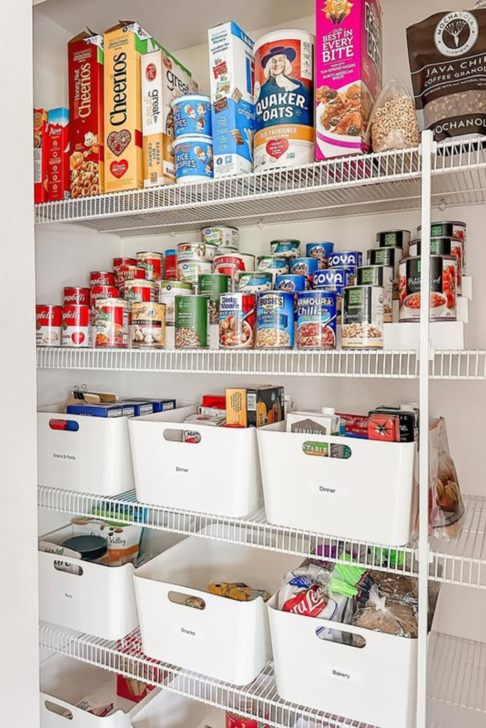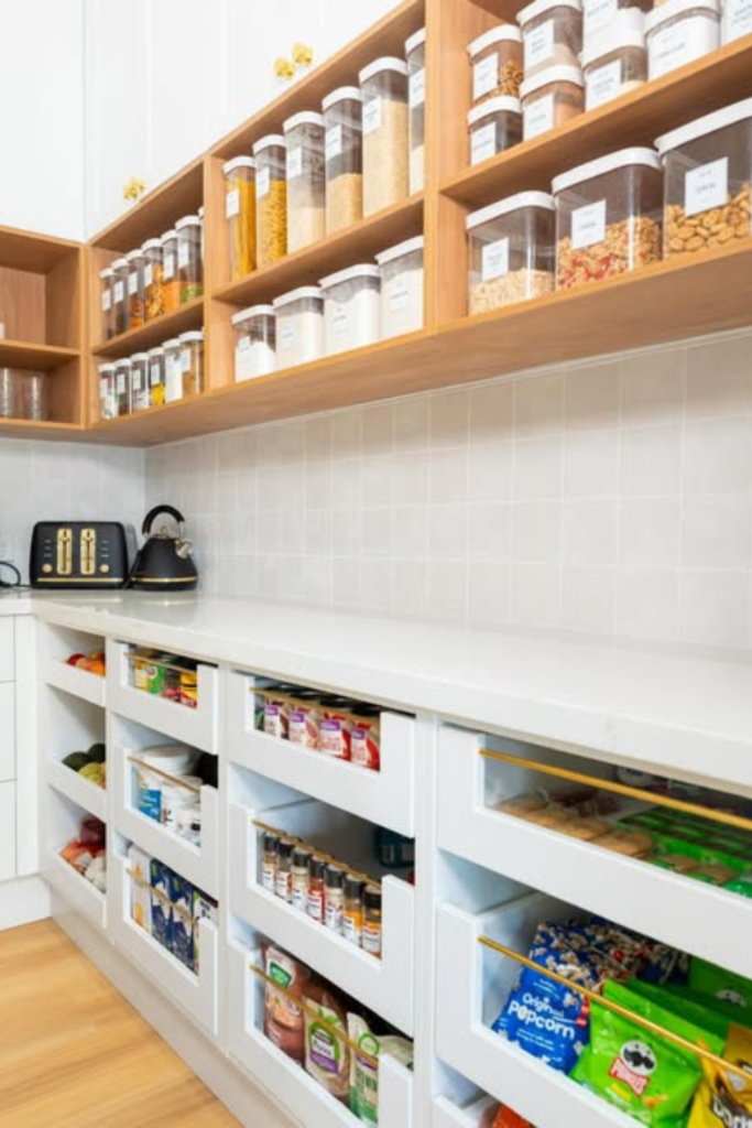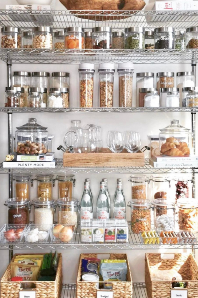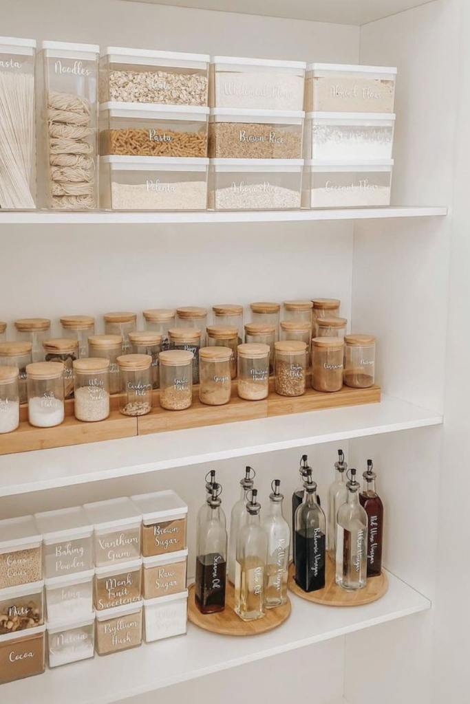 Without making the pantry feel crowded or overly colorful, uniform containers and designated zones help keep things orderly.