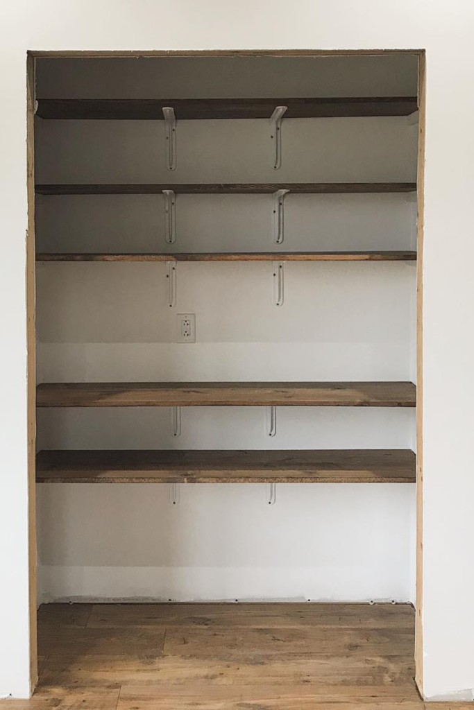 Use plywood or solid wood shelves with simple wood brackets fastened to studs, perfect for wall-length or small pantries.