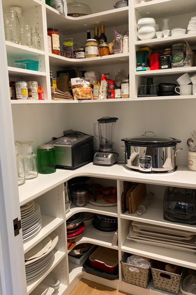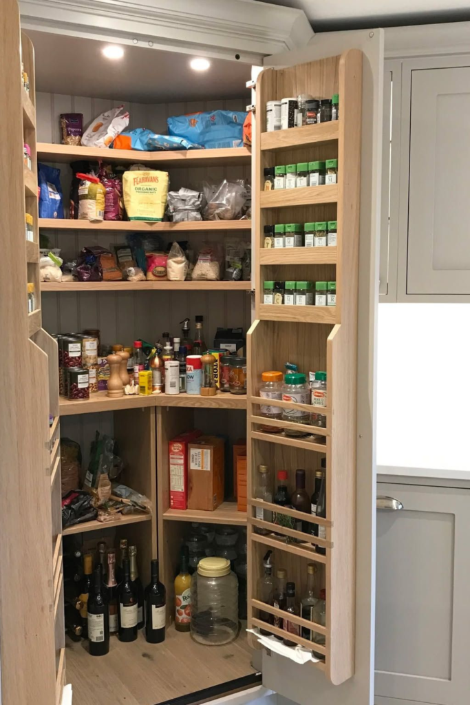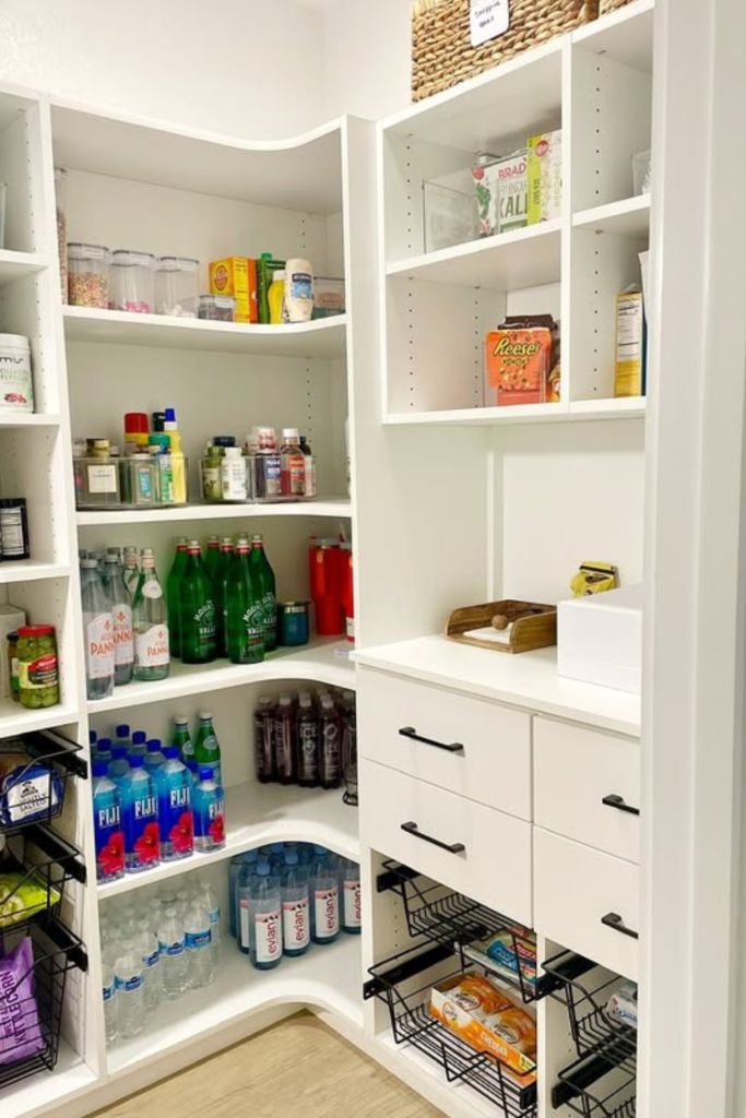 Curved shelves quickly eliminate the wasted space that corners typically create. This is most effective in walk-in pantries.