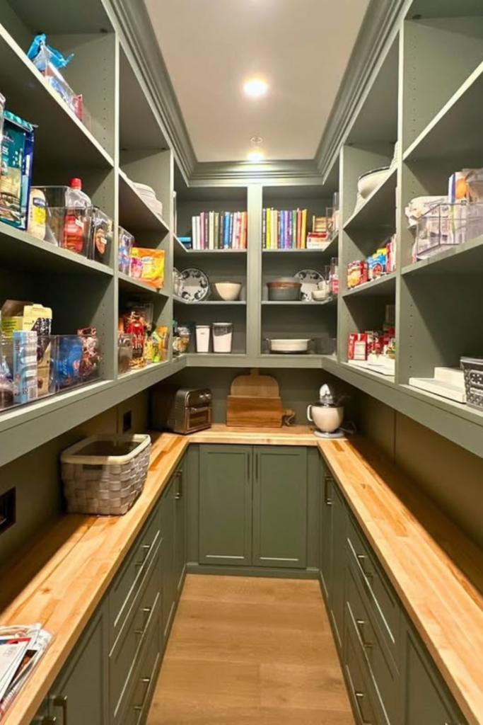 This configuration provides the most storage. Long, narrow pantries with functional walls on both sides are ideal.