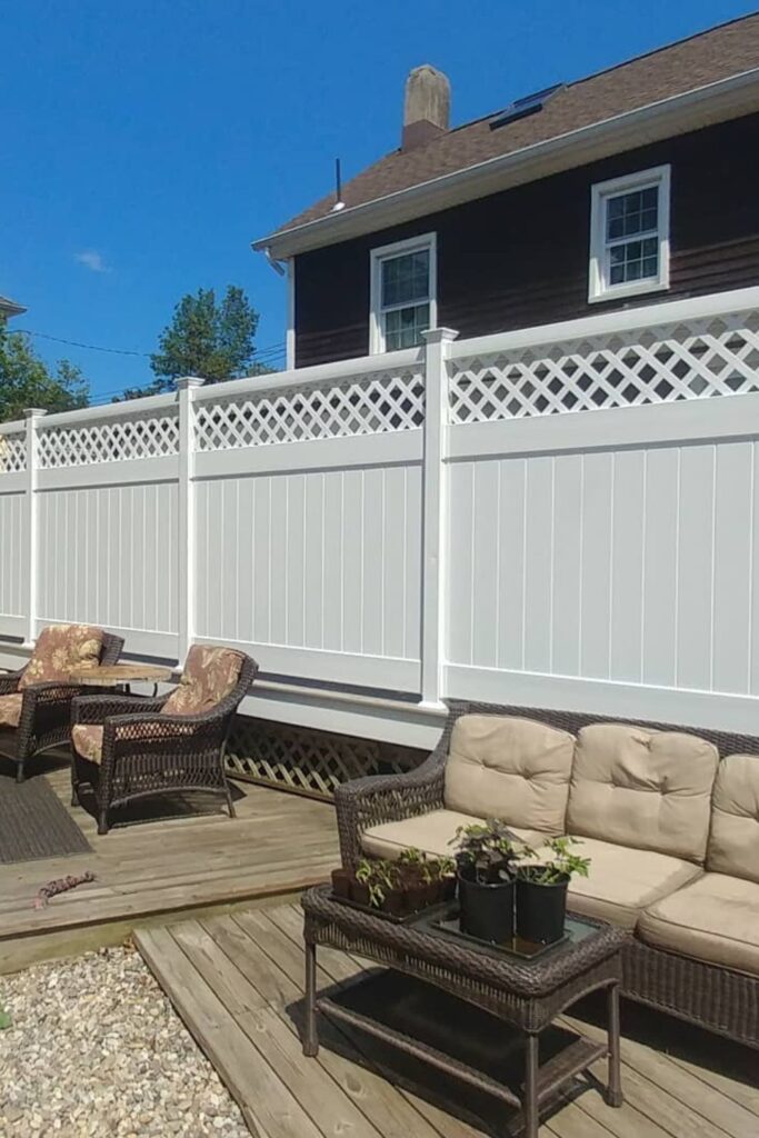 Upgrade your patio with a white vinyl fence topped with a lattice accent.