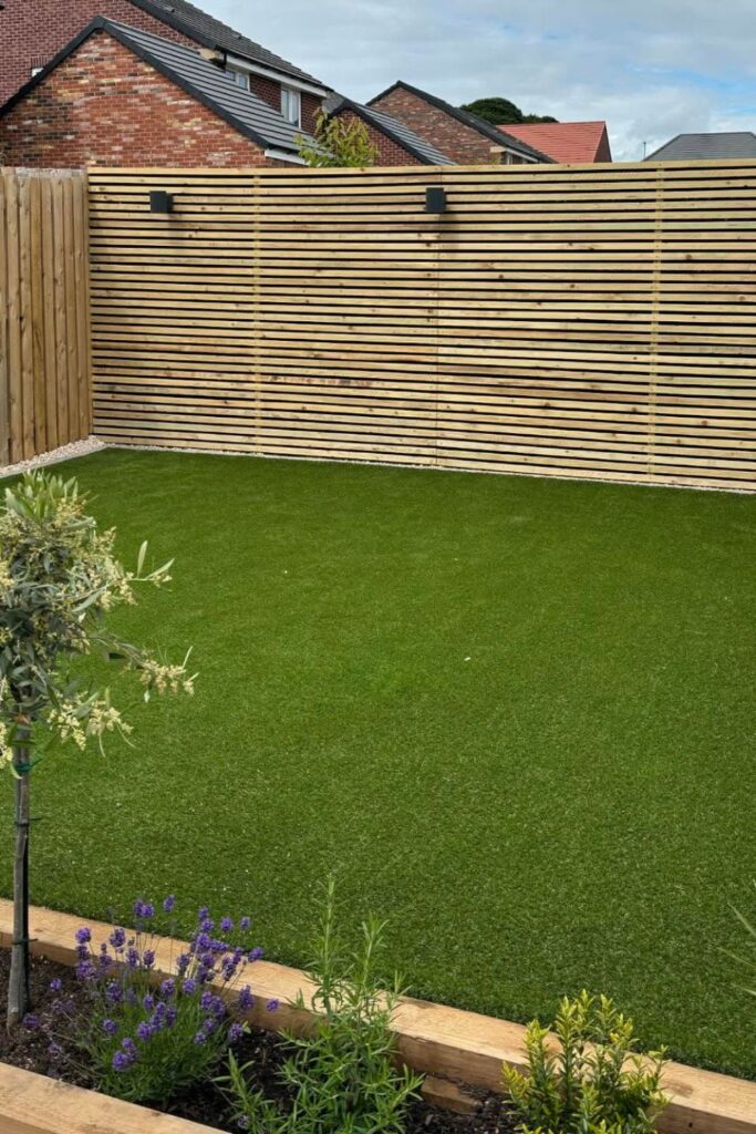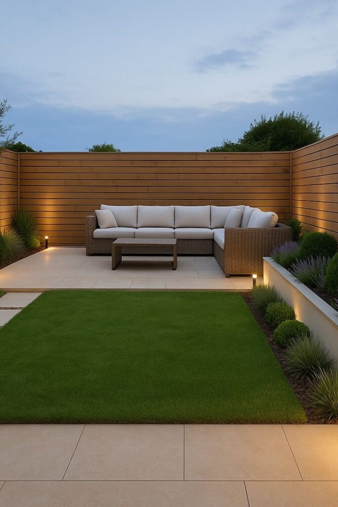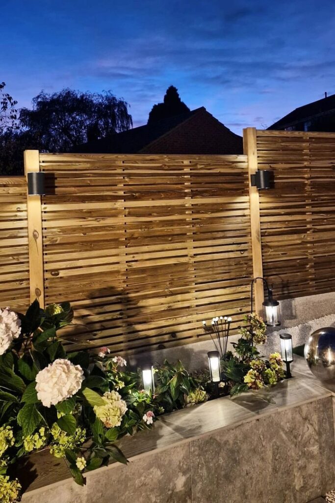 Transform the backyard with a horizontal wooden slat fence featuring built-in lighting.