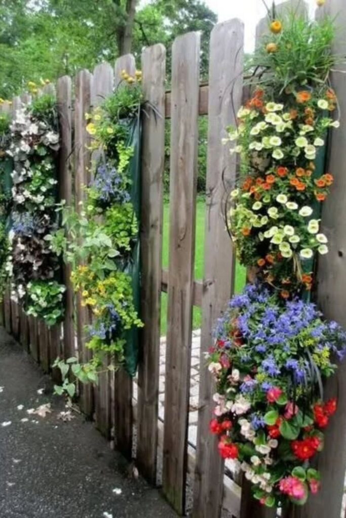 Transform a wooden slat fence into a living masterpiece with colorful hanging planters.