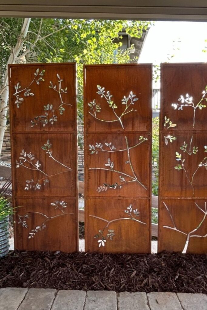 Featuring botanical patterns and a rusted finish, these freestanding panels work as stylish dividers and garden decor.