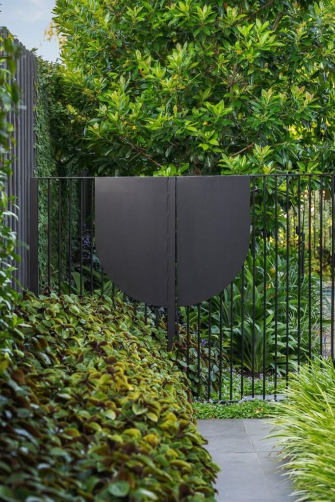 Install a narrow black metal gate with an eye-catching shielded center for privacy and elegance.