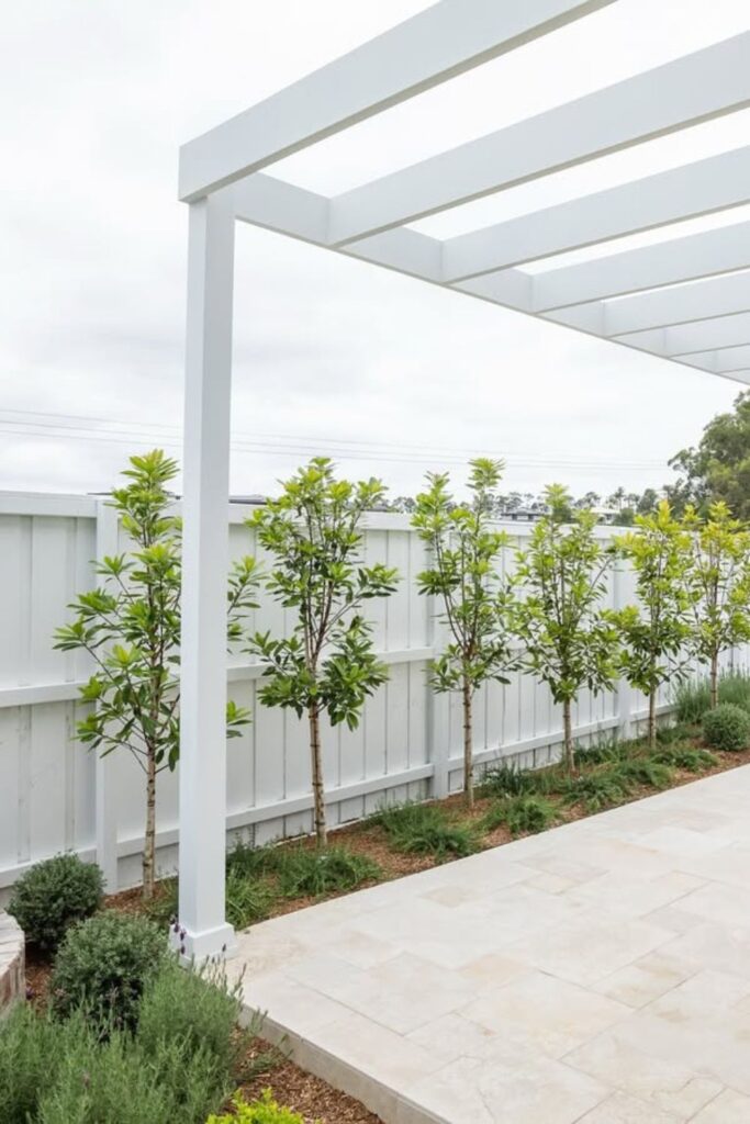 Create a serene space with a painted white fence as the backdrop for your backyard pergola.