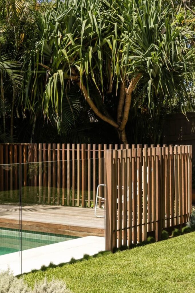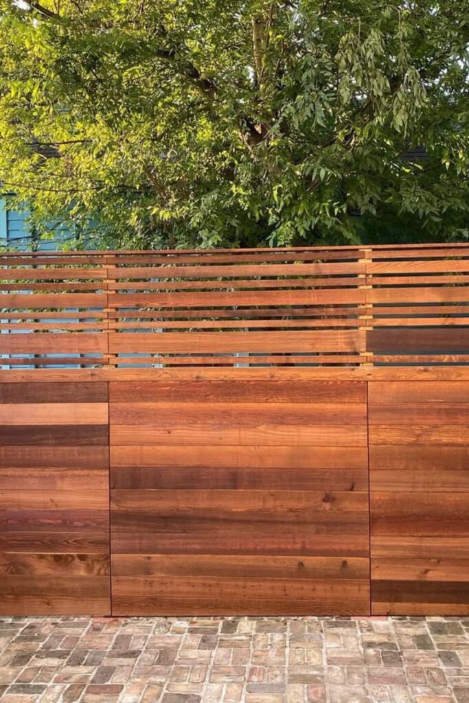 Add depth and style with a mixed horizontal and vertical wooden slat fence.
