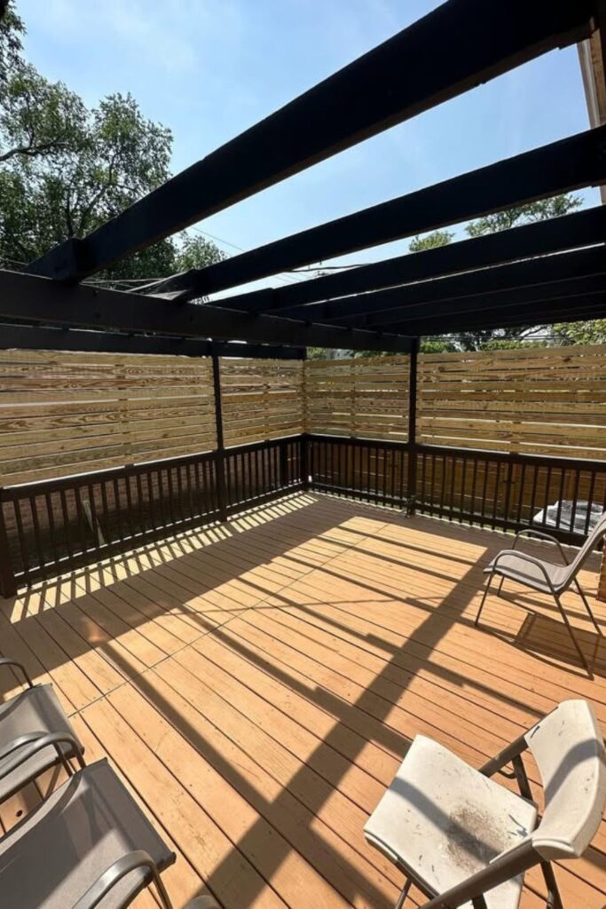 Improve the deck with a horizontal wood slat screen under a bold black pergola frame.