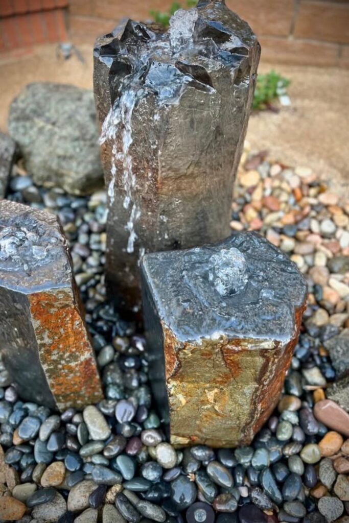 The rugged materials and steady flow create a sturdy, tranquil feature that feels grounded and easy to maintain.