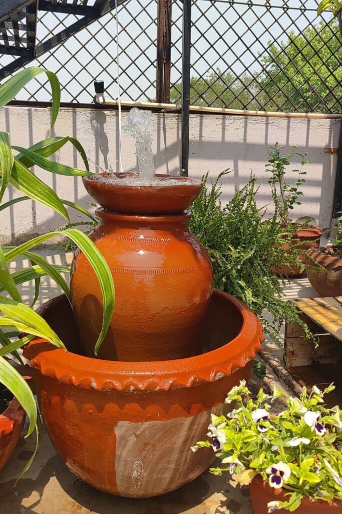 Surrounded by potted plants and rustic decor, this fountain feels cozy and natural, ideal for rooftops, patios, or gardens with a relaxed aesthetic.