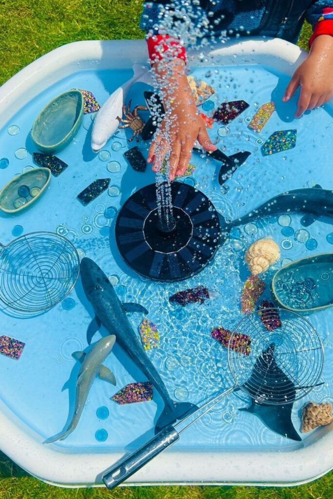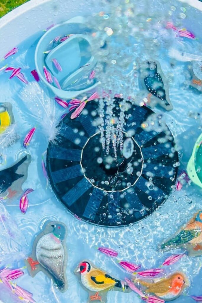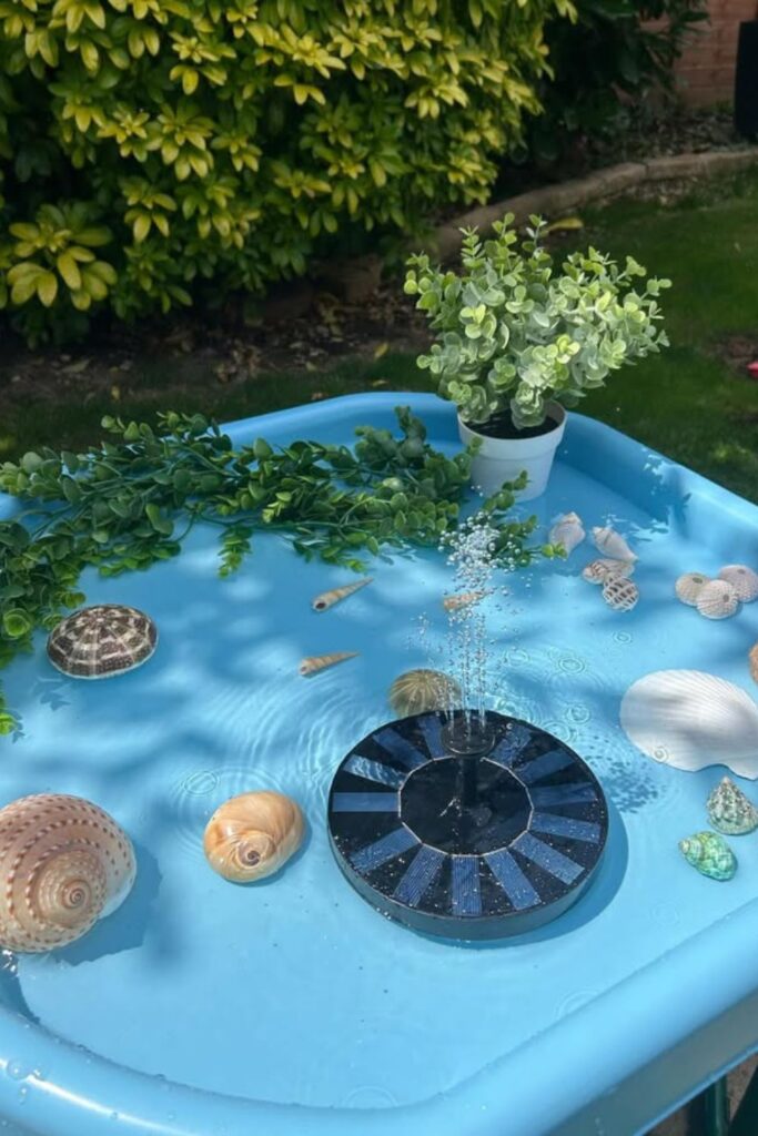 A solar-powered sprayer bubbles water from the center of a shallow blue basin, encircled by sea shells and faux greenery.