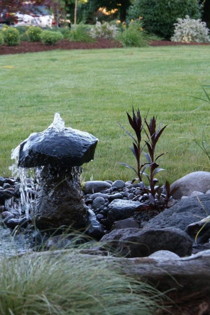 A smooth, large stone lets water flow gently into a bed of river rocks and greenery.